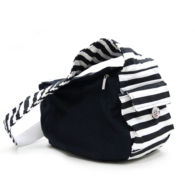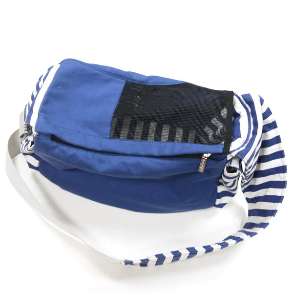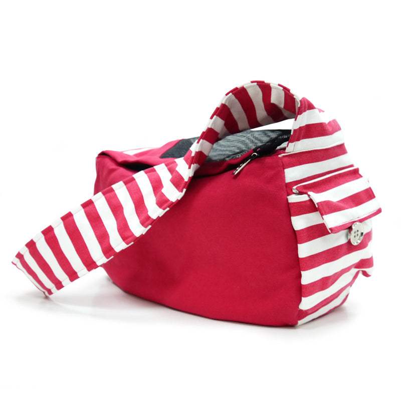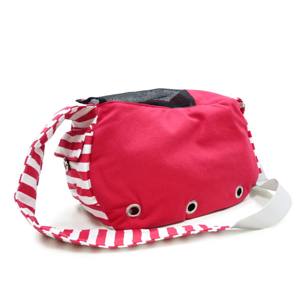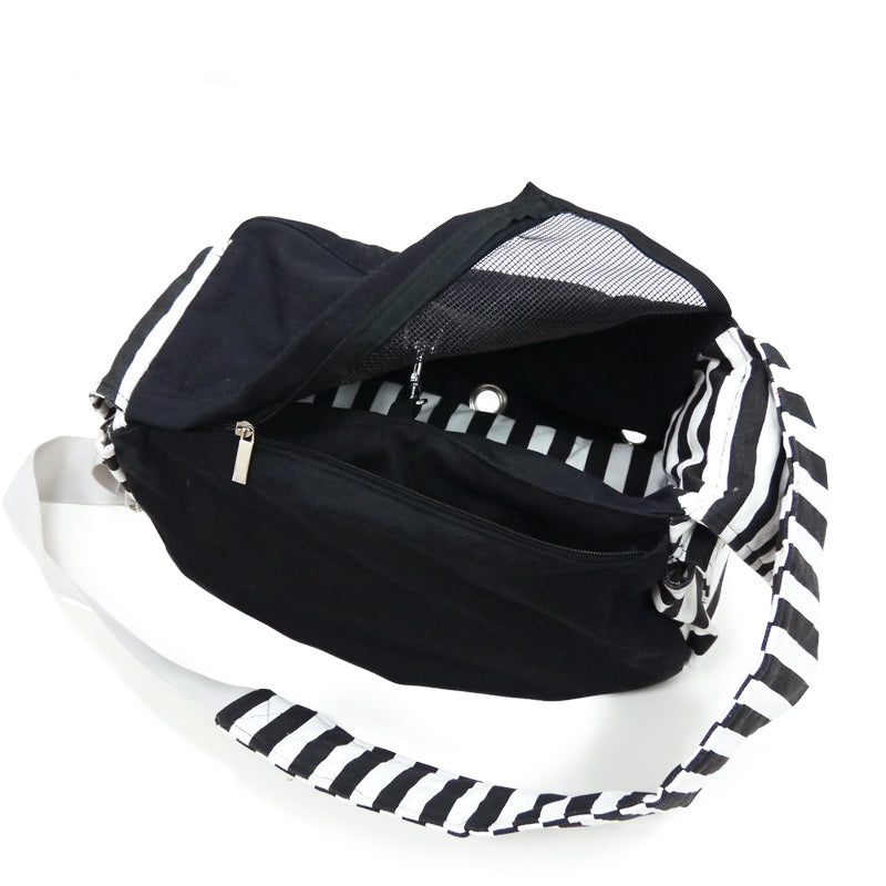 Soft canvas bag with adjustable shoulder strap, side ring air vent, mesh window cover that zips open one side (creating L opening), comfy pillow base, two outer pockets, zipped inner sidewall pocket and a security leash.