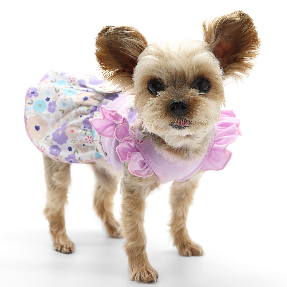 This dress features a chic cross-back design, adorned with a sweet bowtie and a flowery skirt print. With ruffled shoulders and a leash hole for convenience, it’s perfect for any occasion, ensuring your furry friend steals the spotlight in elegance and flair!