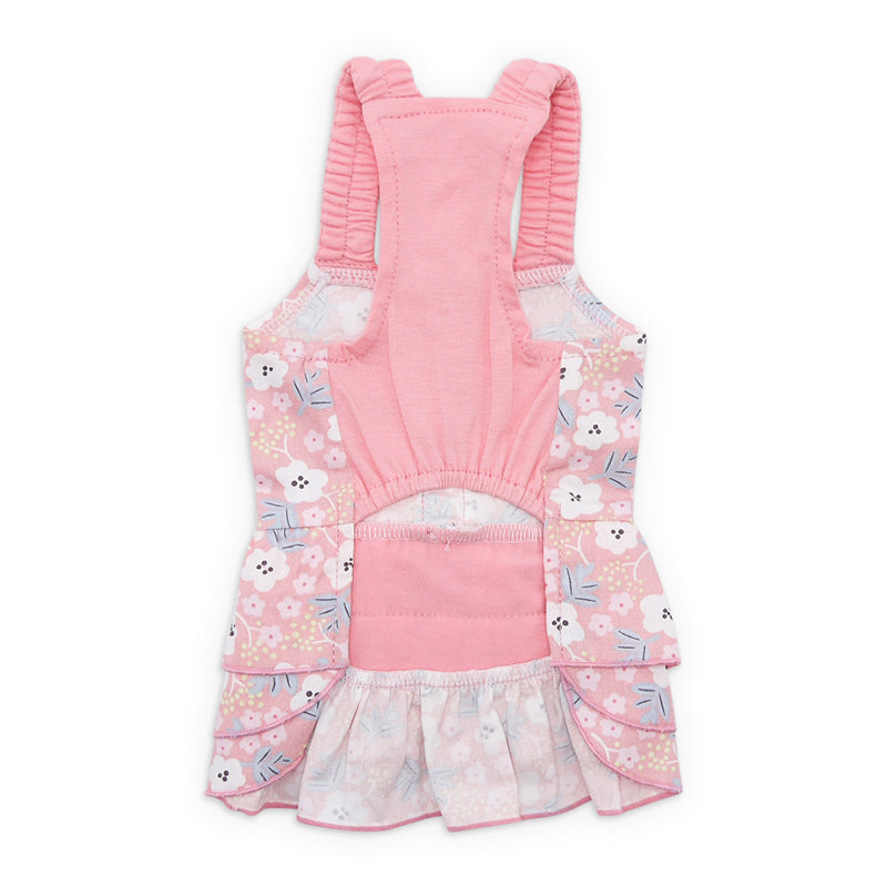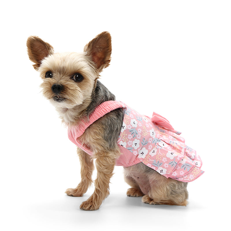 Detailed three-layered skirt dress with floral print, lightly ruffled shoulder strap, and highlighted with a centerpiece double bowtie. Convenient leash hole makes ease of leash attachment.