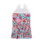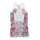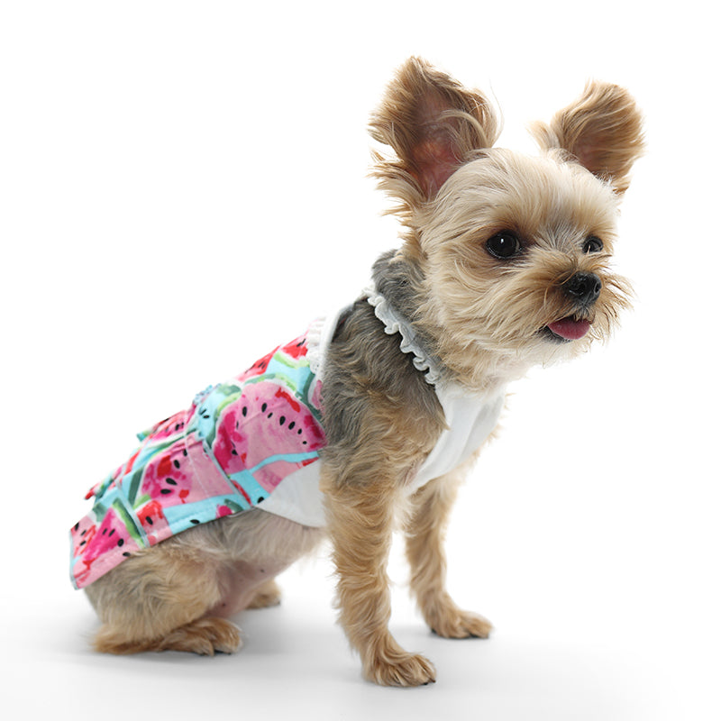 Multilayered dress with summer watermelon graphics. The dress is adorned with a light ruffle trim on the shoulder straps and back, adding an elegant touch to the design. Convenient leash hole makes ease of leash attachment.