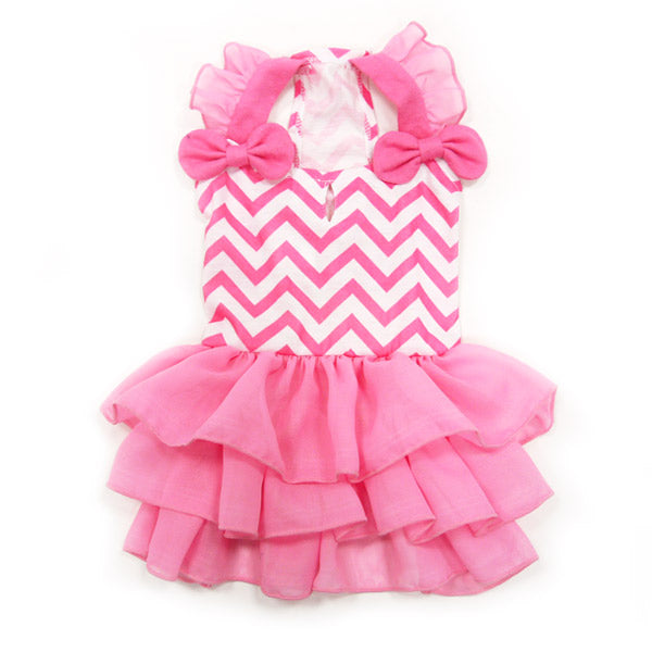 This Chevron Dress in pink and white showcases a triple-layered skirt, adorned with a ruffle shoulder strap and two delightful bows. It also boasts a leash hole for added practicality.