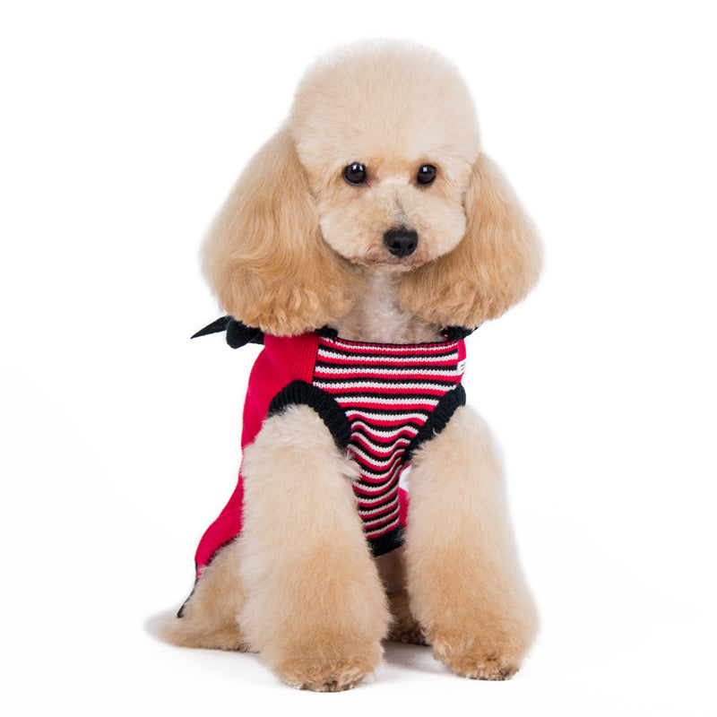 Behold our red Devil Sweater, featuring a mischievous devil face and horns that add a playful touch. The accented black wings on the back complete the charming look. With a leash hole included, it's perfect for walks and outdoor activities. Embrace the versatility of this well-crafted sweater, ideal for both everyday wear and Halloween festivities. Your pup will look absolutely devilishly adorable in this stylish and cozy sweater!