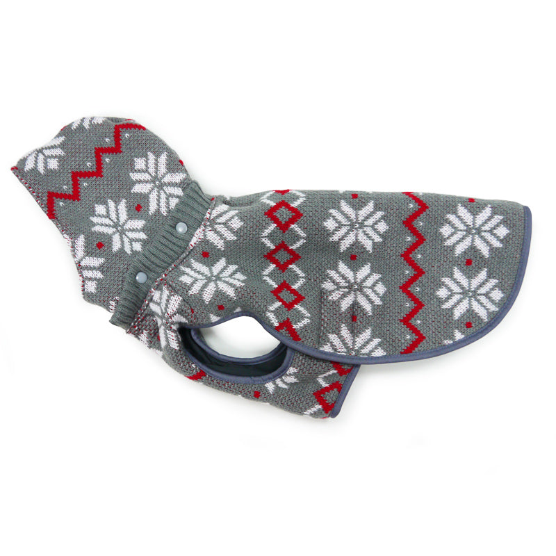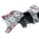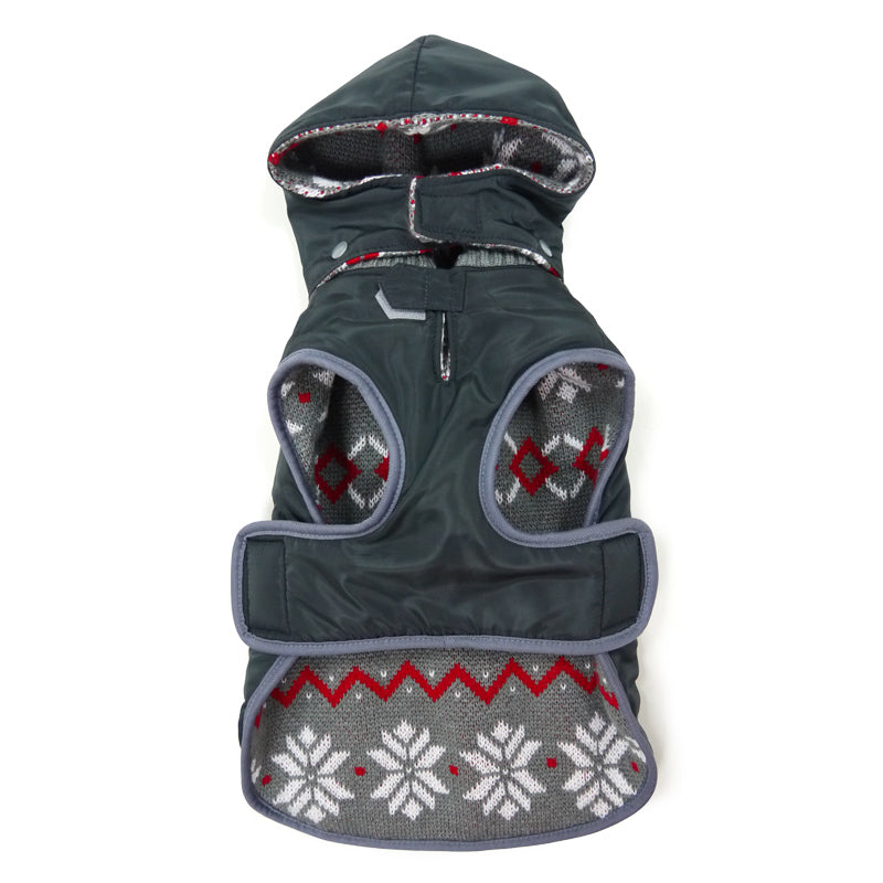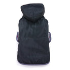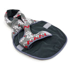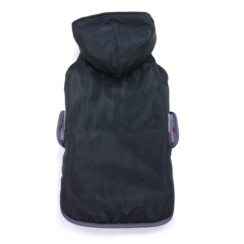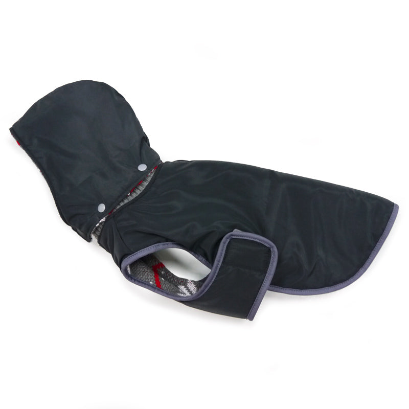 Reversible trench coat with water resistant shell, removable hood, warm fleece lining, and convenient leash hole located around collar. Easy fitting with side Velcro and neck collar opening for adjustability.