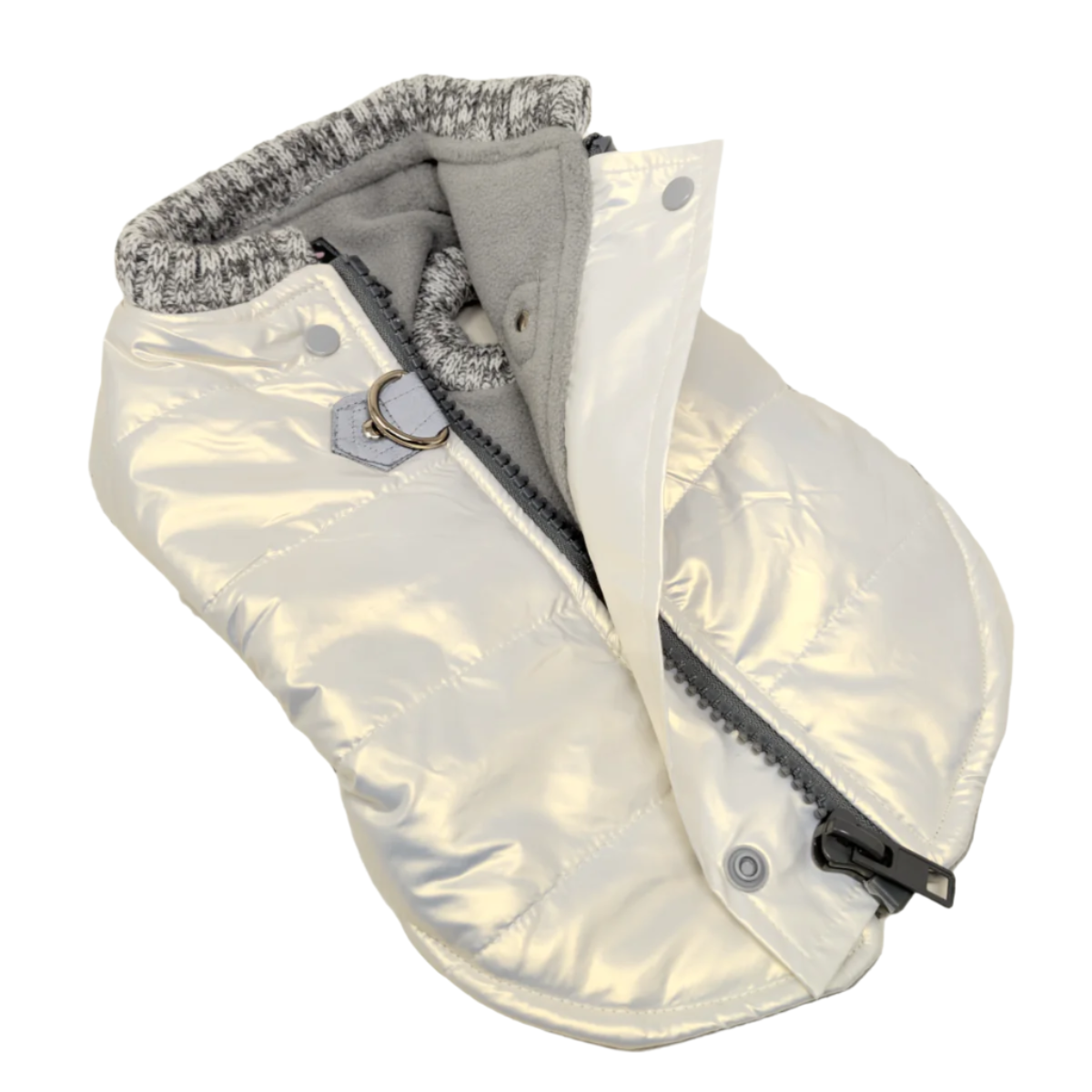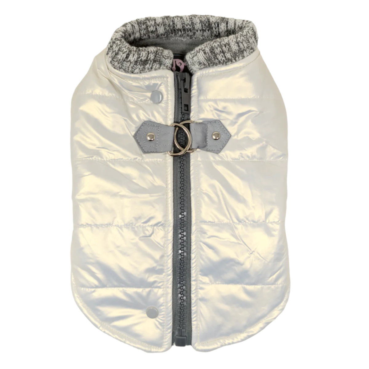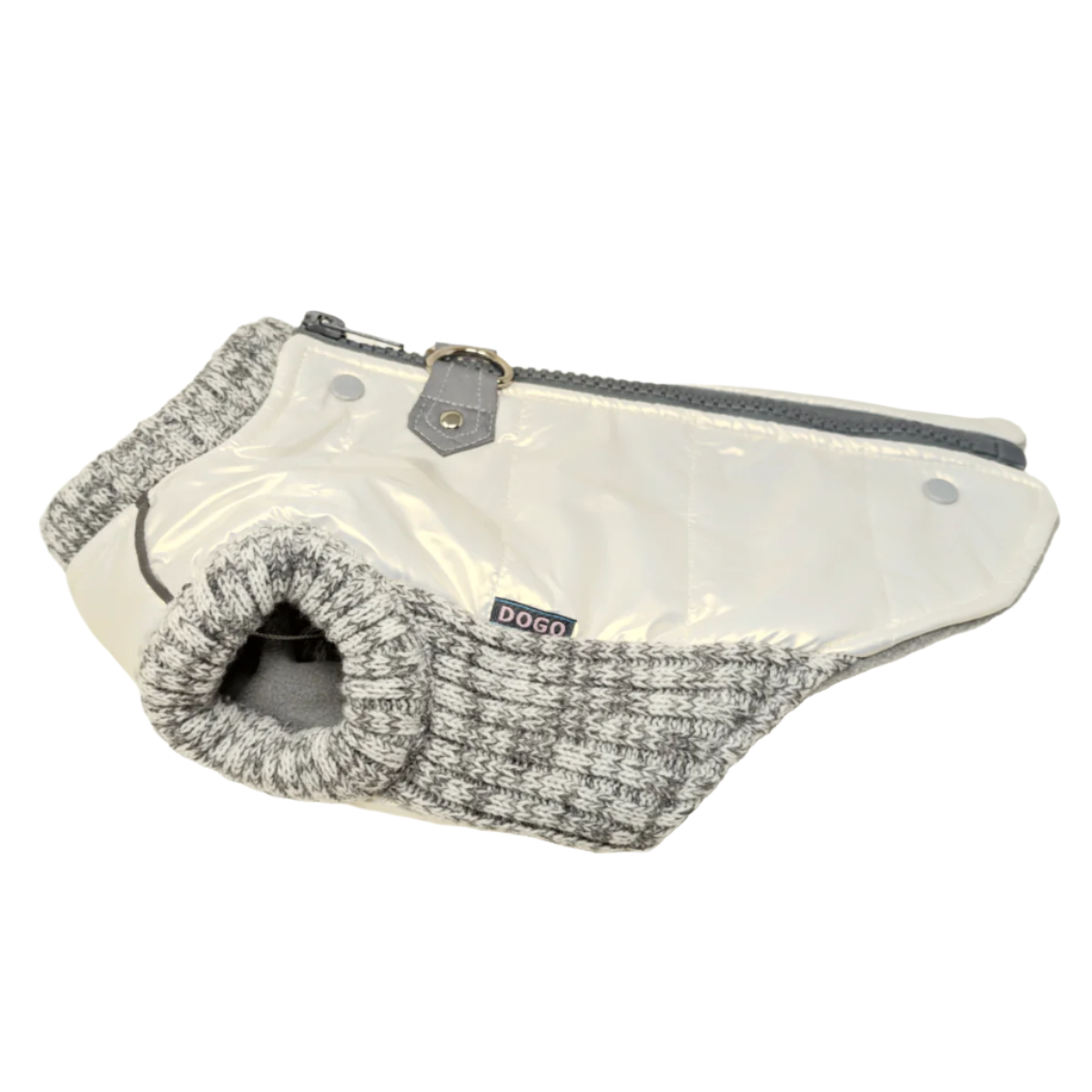 Warm insulated athletic design with top zipper closure featuring metallic color. Water resistance top with mixed knit sweater side and collar trim. Size XS to XL have D-Ring design for leash attachment. Size 2XL to 4XL come with buckle design.