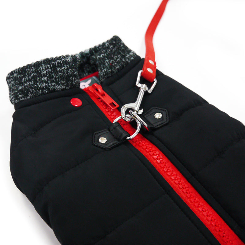 Warm insulated athletic design with top zipper closure featuring metallic silver color. Original design features mix-knit side and collar trim. Size XS to XL have D-Ring design for leash attachment. Size 2XL to 4XL come with buckle design.