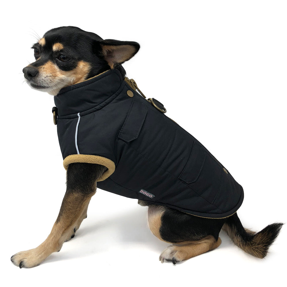 Durable warm insulated modern rustic design with top zipper closure adorning functional pockets designs. Size XS to XL have D-Ring design for leash attachment. Size 2XL to 4XL come with buckle design.